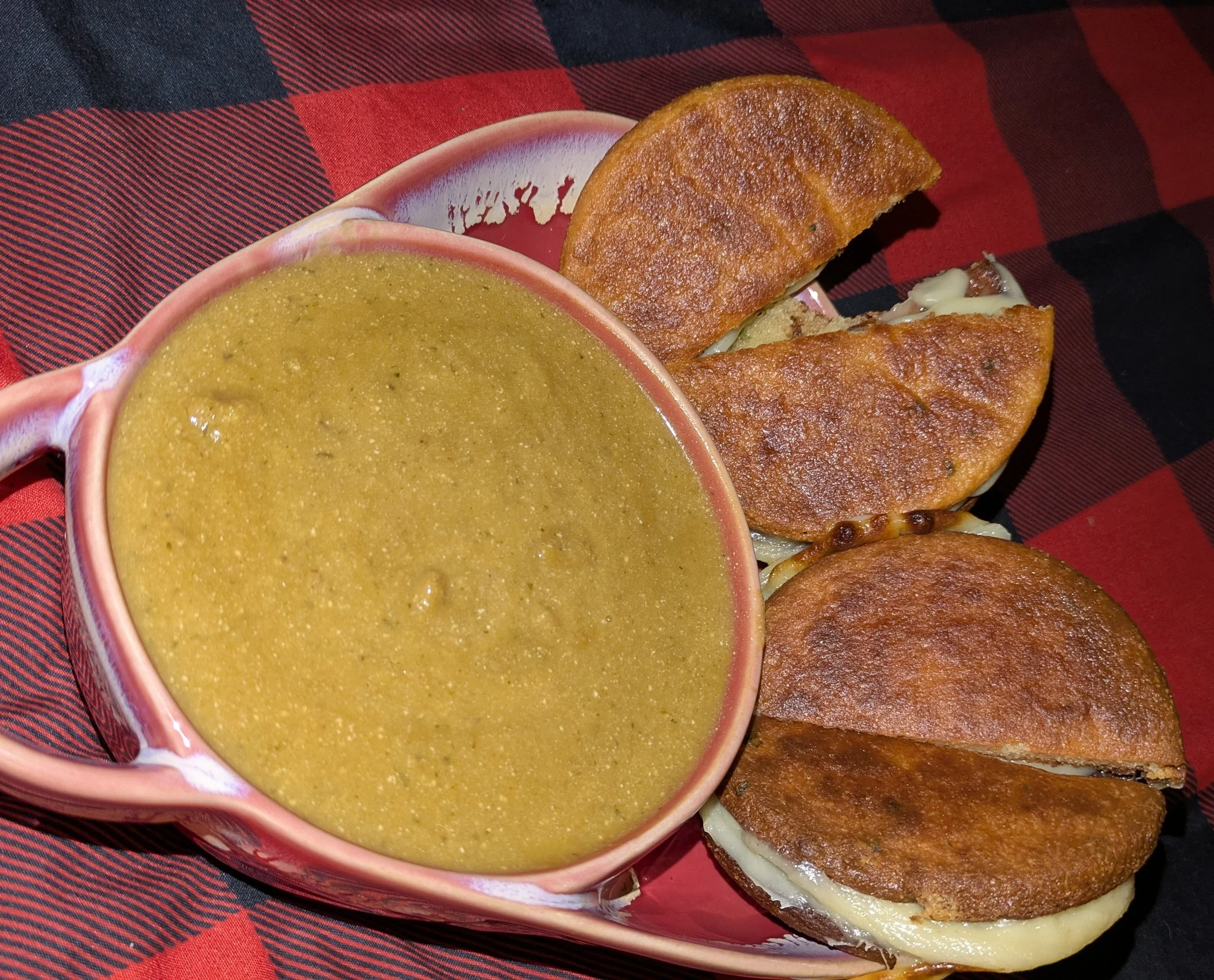 I make a lot with Fathead Dough as it is very versatile and can be used for sweet or savory breads and desserts. The photo shows a grilled cheese with my Blended Soup (recipe below). I make large batches at a time and freeze them so I always have items on hand when I don't have time to cook a complete meal.